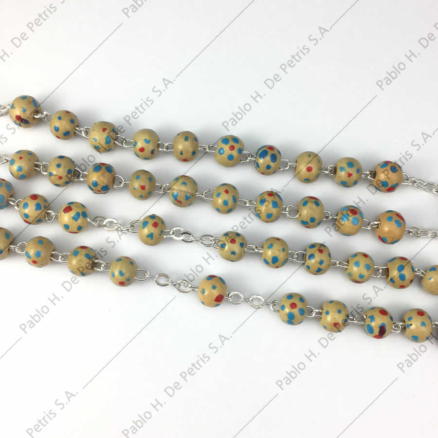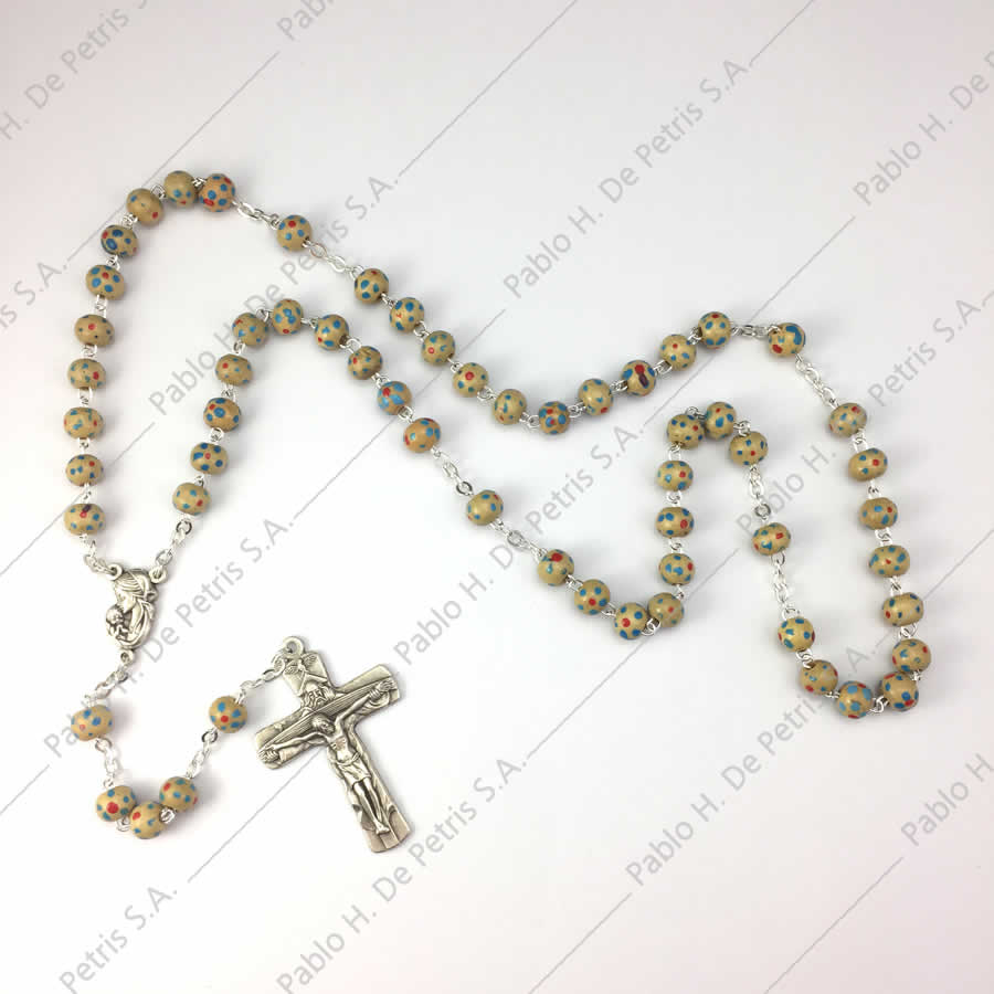 Rosario italiano con cuentas de madera decoradas.